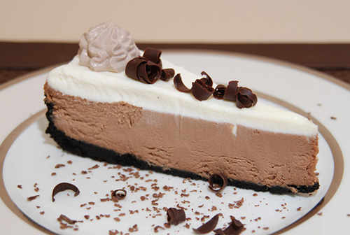 Creamy chocolate cheesecake flavored with Grand Marnier Liqueur. Topped with sour cream and chocolate curls. A classic dessert.