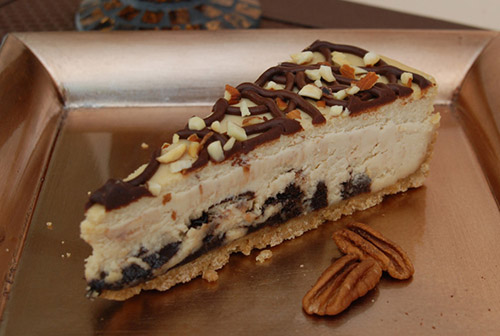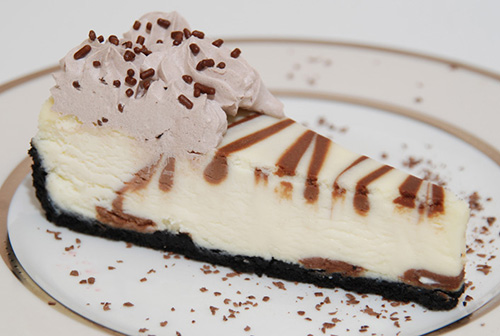 One of our most favorite flavors! Delicious coffee-flavored cheesecake with chocolate swirled in. topped with more chocolate swirls and chopped almonds.