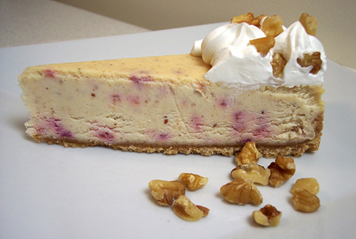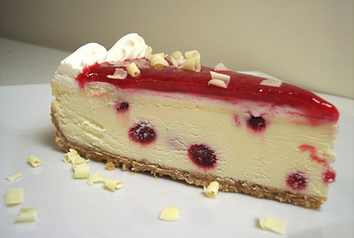 New York Style cheesecake with a wonderful raspberry swirl. The cheesecake is topped with our special white chocolate cream cheese frosting and finished with the best raspberry sauce you have ever tasted. This cheesecake is to die for!