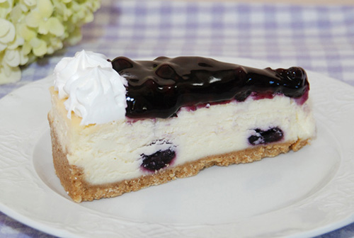 Smooth, rich cheesecake with whipped cream and wild blueberry topping. An all time favorite!