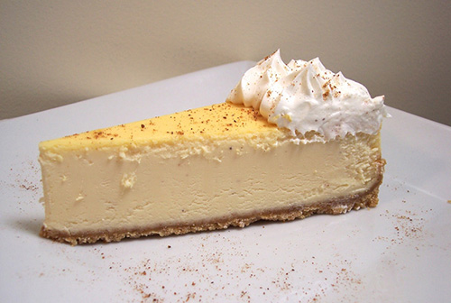 Special Eggnog flavored cheesecake decorated with whipped topping and a sprinkling of nutmeg. Described by one executive chef as being the best eggnog dessert he had ever tasted. Bound to be a hit at your Holiday party!