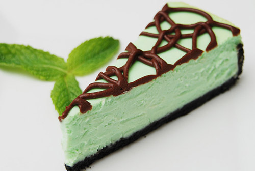 This cake is for chocolate and mint lovers. Light mint flavored cheesecake drizzled with chocolate. Absolutely delicious.