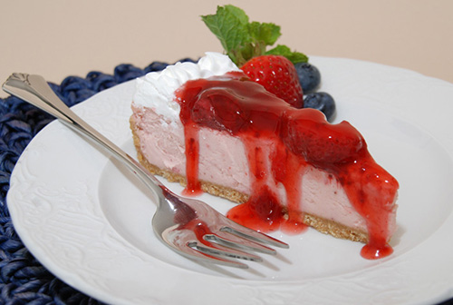 This cheesecake is a strawberry from top to bottom. Colorful strawberry cheesecake covered with our very own strawberry topping. One of our most popular cheesecakes.